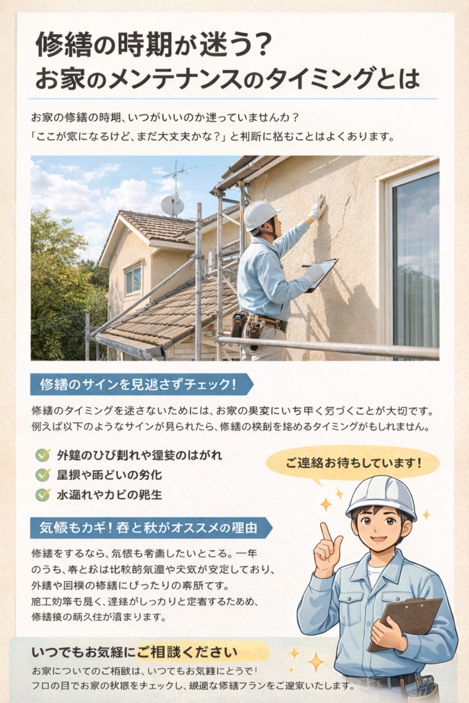 さらに、季節も重要なポイントです。気温や湿度が安定している春や秋は、施工の仕上がりが良くなりやすく、修繕に適した時期とされています。